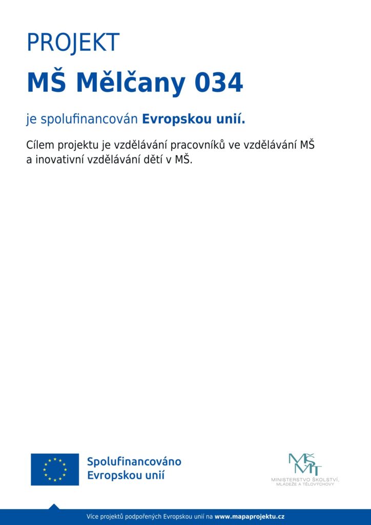PROJEKT MŠ MĚLČANY 034 Naše mateřská škola se k 1.3.2025 zapojila do projektu MŠ Mělčany 034 v rámci Operačního programu Jana Amose Komenského (OP JAK). Tento projekt je spolufinancován Evropskou unií. Plakát k projektu zde: